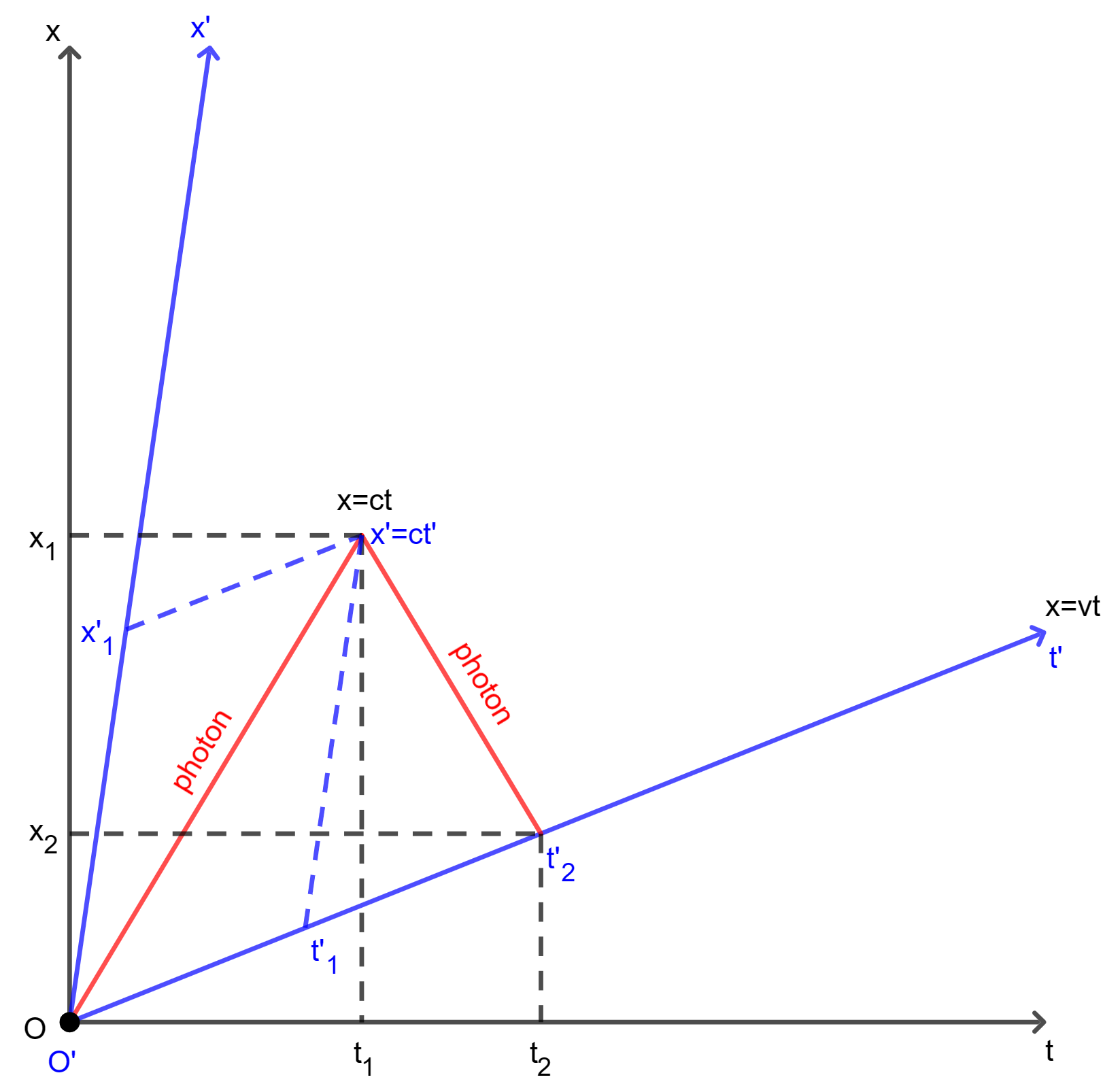 \[\begin{aligned} x &= x_1 - c(t - t_1) = (x_1 + ct_1) - ct = 2ct_1 - ct \\ \iff x' &= x'_1 - c(t' - t'_1) = (x'_1 + ct'_1) - ct' = 2ct'_1 - ct' \\ \end{aligned}\]Next, at time $t = t_2$ in $F$, the photon arrives at the origin $O’$ moving along $x$-axis with velocity $v$ in $F$. Therefore, at time $t = t_2$ in $F$, both the photon and the origin $O’$ are at the same place.